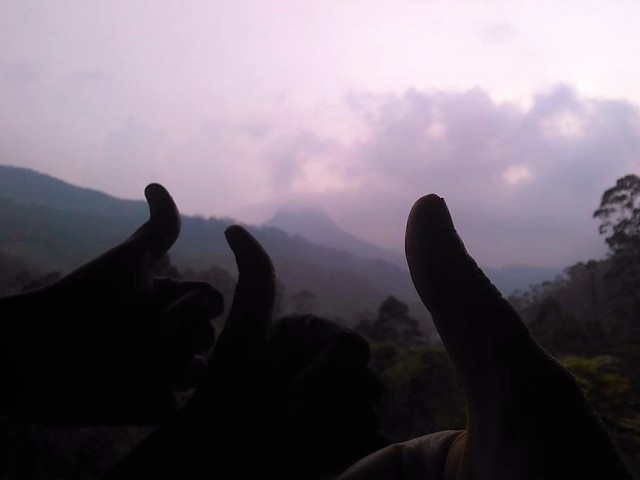 Etwa ab der Hälfte der ca. 30 km langen Fahrt von Hatton nach Delhousie kann man den Heiligen Berg hin und wieder von allen Seiten sehen. Mein persönliches Highlight unserer 2-tägigen Tour war exakt der Moment, als Charitha und Nadisha ihren Sri Paada das erste Mal live und in seiner vollen Größe vor sich hatten. Ihnen ist quasi ALLES aus dem Gesicht gefallen; die Augen wurden groß, die Kinnlade klappte herunter und die vom frischen Wind völlig zerzausten Haare machten den Anblick nicht unbedingt besser. Völlig ungläubig und den Blick kaum vom Berg lösend schauten sie mich an und fragten: „Sollen wir da wirklich hoch?“ – „Ja, Mädels, sollt ihr! Hat ja keiner behauptet, dass das hier einfach wird.“