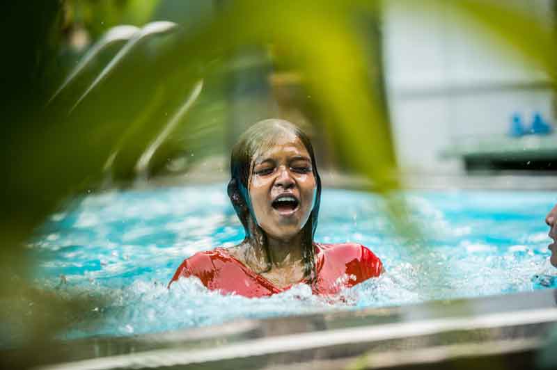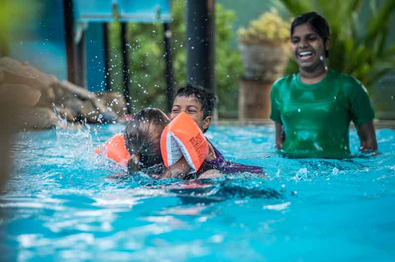 Man darf nicht vergessen, dass die meisten Mädchen hier bei uns zum ersten Mal in ihrem Leben das Gefühl von Schwerelosigkeit im Wasser erleben und darauf reagieren sie total unterschiedlich. Während wir in Deutschland durch Babyschwimmen und regelmäßige Badeausflüge von klein auf an dieses Gefühl gewöhnt sind, so hat der Durchschnitts-Singhalese weder eine Badewanne, noch lernt er in der Schule schwimmen oder war schon einmal weiter im Meer, als dass ihm das Wasser bis zu den Oberschenkeln reicht. Somit wirft es unsere Girls (vor allem die älteren) teilweise ganz schön aus der Bahn, wenn sie das erste Mal spüren, wie anders das Körpergefühl im Wasser eigentlich ist.