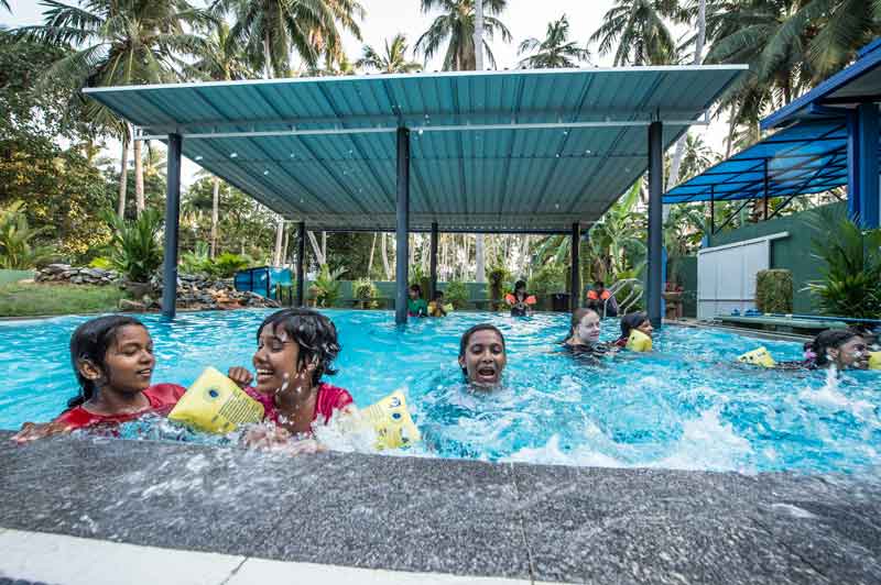Ursprünglich sollte die freie Fläche vor unserer Ausbildungsstätte als Gartenteich genutzt werden, denn für alle, die auch das noch nicht wissen (obwohl das fast unmöglich ist): Frank steht auf alles, wo man Fische rein tun kann und besonders viele passen natürlich in einen großen Teich. ???? Also wurde eine große Grube ausgehoben und mit Zement ausgegossen, um darin dann Fische, Pflanzen und alles, was sonst so kreucht und fleucht, unterzubringen. Erst einmal musste jedoch getestet werden, ob der Zement auch richtig getrocknet ist und kein Wasser hindurch lässt. Also einmal die Grube voll Wasser laufen lassen und diese Gelegenheit kann man ja gleich nutzen, um mit den Mädels eine Runde plantschen zu gehen. Die Quintessenz davon war schließlich, dass die Mädels dabei so viel Spaß hatten, dass sie ihren „Thaththa“ hinterher förmlich anflehten, daraus keinen Gartenteich, sondern einen Pool zu machen. Und was bleibt Frank bei so vielen braunen Kulleraugen schon übrig, als nachzugeben und ein Badeparadies zu errichten? Immerhin ist so ein Schwimmbecken in Sri Lanka lange nicht so teuer wie in Deutschland, wo man für einen Pool in dieser Größe (ca. 7,50 m x 6,50 m) mal eben locker 20.000 Euro hinlegt. Dank der Hilfe vieler fleißiger Kinderhände und einer fairen Fliesenleger-Truppe kostete unser Pool unterm Strich schließlich ca. 5.300 Euro und das war uns der Spaß definitiv wert!