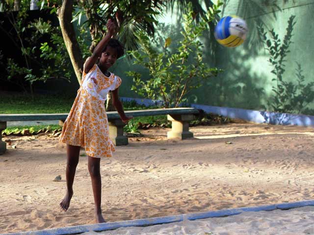 Beim gemeinsamen Volleyballspielen ist Madushika eine erwünschte Mitspielerin, die aktiv mithilft, auch schwierige Bälle gekonnt über das Netz zu spielen. Sie kann bereits gut zusammenspielen und hat sich hier einiges von der sportlichen Sodi abgeschaut, die sie auch ein wenig nachzuahmen scheint.