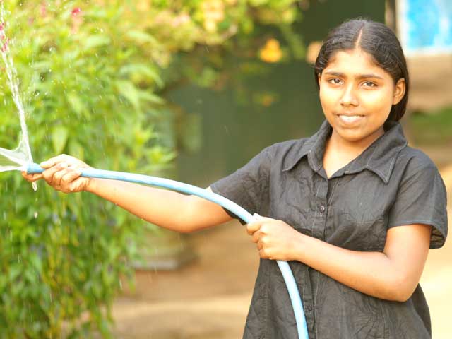 Anfang Februar haben in unserer Ausbildungsstätte wieder neue Kurse in den Bereichen Kosmetik, Schneiderei und Friseurwesen begonnen und wir haben Nishadika vorgeschlagen, doch so wie 3 andere Mädchen aus dem Angels Home einen Kurs ihrer Wahl zu belegen. Zu unserer Überraschung teilte sie uns jedoch mit, dass sie kein Interesse an den angebotenen Ausbildungen hat und stattdessen lieber der volljährigen Nadisha bei der Gartenarbeit helfen möchte. (Nadisha ist eines unserer älteren Mädchen, die derzeit an unserem neuen Ausgliederungsprojekt teilnehmen. Dabei bekommen 2 Mädchen, die mit der Schule fertig sind, zusammen ein kleines Wohnhaus sowie einfache Jobs von uns, womit sie sich etwas Geld verdienen können. Das Hauptziel ist, dass sie sich komplett selbst versorgen und somit vor ihrem Auszug aus dem Angels Home etwas selbstständiger und sicherer im Umgang mit Geld, Haushalt etc. werden.) Wir haben uns also damit einverstanden erklärt, dass Nishadika am Vormittag im Garten helfen darf, auch aus dem einfachen Grund, damit Nadisha diese Arbeit nicht allein verrichten musste. Seitdem sind die beiden Mädchen sehr gute Freundinnen geworden und haben jeden Tag ziemlich viel Spaß bei ihrer Arbeit. Nishadika genießt die Aufmerksamkeit der schon lange im Heim lebenden und deshalb sehr angesehenen Nadisha und diese wiederum sieht Nishadika als eine Art Schützling, dem sie viel beibringen kann und mit dem sie außerdem viel lachen kann bei ihrer Arbeit.