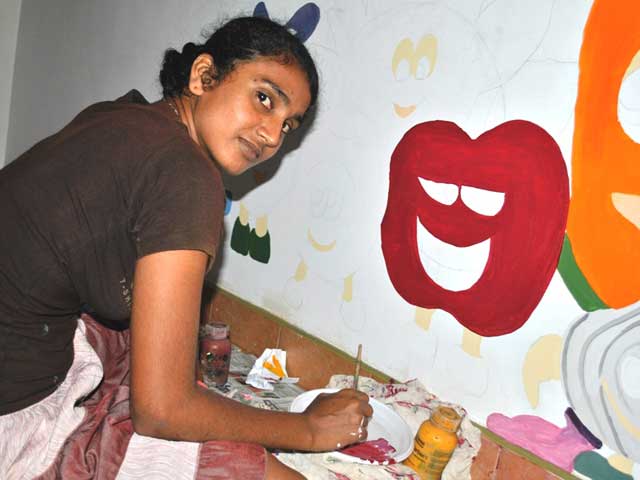 Im Heimalltag wird die leidenschaftliche Künstlerin von allen Mädchen akzeptiert und bewundert. Das liegt nicht nur an ihrem Alter, sondern an ihrem ausgeprägten Talent zum Malen, Basteln, Dekorieren und Gestalten. So durfte Sewandi kürzlich unsere Küchentheke mit einem witzigen Obst- und Gemüsebild verzieren. Außerdem hat sie das Logo für unsere Ausbildungsstätte im Großformat an die eine Außenwand des Gebäudes gemalt. Gibt man Sewandi eine solche Aufgabe, so nimmt sie diese sehr ernst und widmet sich gewissenhaft ihrer Umsetzung. Es kann dann auch mal vorkommen, dass man die junge Dame abends ermahnen muss, nun endlich den Pinsel zur Seite zu legen, sonst würde sie vermutlich die ganze Nacht hindurch malen. Auch beim Gestalten von Glückwunschkarten gibt sich Sewandi stets die allergrößte Mühe und wir sind immer wieder erstaunt, woher sie ihre Ideen und die Kreativität nimmt. Wir hoffen sehr, dass sie dieses Talent später auch einmal beruflich anwenden kann und möchten ihr gerne den Weg dafür ebnen. In einem ersten Schritt streben wir gerade an, Sewandis künstlerische Produkte Besuchern anzubieten und das daraus gewonnene Geld für ihre Zukunft anzusparen.
