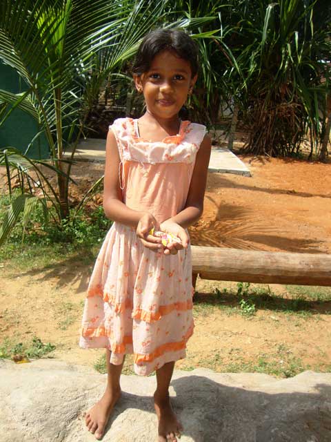 Kalpeni ist mittlerweile 9 Jahre alt und besucht gemeinsam mit 4 anderen Mädchen aus dem Angels Home schon die vierte Klasse. Nach eigenen Angaben geht Kalpeni gerne zur Schule und findet auch den gelehrten Unterrichtsstoff nicht schwer. Ihre Leistung spiegeln jedoch ein anderes Bild wider. Leider konnte sie in den letzten Examensprüfungen im Durchschnitt nicht einmal die Hälfte der maximalen Punktzahl erreichen. Dabei sind wir ziemlich sicher, dass dies nicht unbedingt an mangelnder Intelligenz liegt, sondern viel mehr an Kalpenis Unkonzentriertheit. So ist sie auch in der Englisch-Nachhilfe nach wie vor der Klassenclown und Spaßvogel und findet manchmal in ihrer Gaukelei nicht so recht einen Schlussstrich. Dann muss man sie schon einmal ermahnen und zur Ordnung rufen. Dennoch hat sich ihr Englisch im letzten Jahr noch einmal verbessert und sie versteht nun meistens, was man zu ihr sagt. Oft kann sie auch in ganzen Sätzen antworten.
