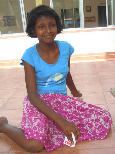 Zum Zeitpunkt ihres Einzugs am 16. September 2010 ist Sawani 10 Jahre alt, obwohl sie uns allen vom äußeren Erscheinungsbild her wesentlich älter vorkommt. Seit dem 20. September 2010 besucht sie gemeinsam mit Shakina die 5. Klasse der lokalen Schule in Mudukatuwa. Zu ihren Lieblingsfächern zählen Singhalesisch und Handarbeit. Sie hatte in ihrer bisherigen Schule zwar Englischunterricht, tut sich aber bislang noch schwer, Englisch mit uns zu sprechen. Als eines ihrer Hobbies gibt sie das Malen an, am liebsten mag sie die Farbe Pink. Außerdem spielt Sawani sehr gerne und hat sich recht schnell im Alltag unseres Angels Home for Children integriert. Erfreulicherweise konnten wir nun auch für Savani Pateneltern finden.