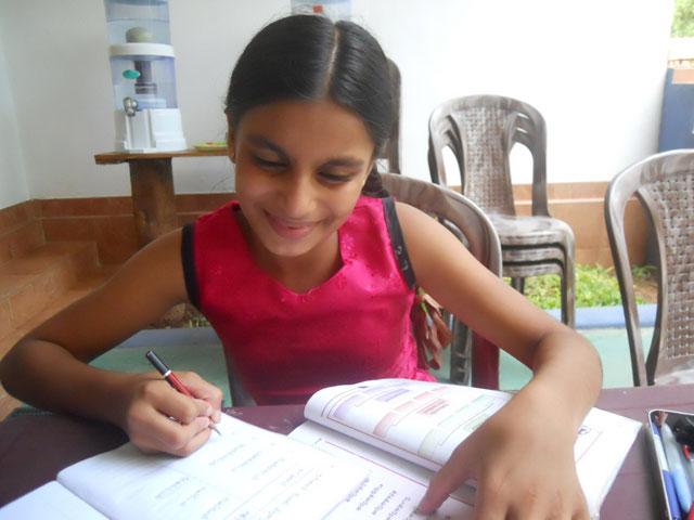 Seit Anfang des Jahres besucht Kavindiya nun auch die katholische Mädchenschule in Marawila. Die neue Schule gefällt ihr sehr gut, da die Lehrer besser und motivierter sind. Allerdings findet sie die neue Schule im Vergleich zu ihrer alten Schule schwieriger, sodass sie mittlerweile mehr lernen und oft viele Hausaufgaben bewältigen muss. In Chanchala, Hasini und Chathumini hat sie aber Freundinnen gefunden, die sie bei den Hausaufgaben gelegentlich unterstützen. Das Fach Erdkunde empfindet sie als besonders schwierig, da sie nicht so gerne Landkarten auswendig lernt. Science und Religion als ihre Lieblingsfächer bereiten ihr dagegen keine Probleme und bringen ihr sehr viel Spaß. Insgesamt hat sie das Ziel, später auf jeden Fall das O-Level zu schaffen. Neben dem Schulunterricht besucht Kavindiya zusätzlich die im Angels Home angebotenen Kurse in Mathematik, Tanzen, Singhalesisch und Englisch. Die Englischnachhilfe bei den Praktikantinnen besucht sie zusammen mit Shakina, wobei sie stets sehr motiviert ist und den Anforderungen gerecht wird. Insgesamt hat sie ein gutes Verständnis, eine sehr gute Merkfähigkeit (z.B. bezüglich des Lernens von Vokabeln) und auch das Wiedergeben von Textinhalten klappt mittlerweile schon ganz gut. Im Gegensatz dazu bereiten ihr Lesen und Schreiben noch einige Schwierigkeiten, sodass sie da in Zukunft noch mehr Übung braucht.