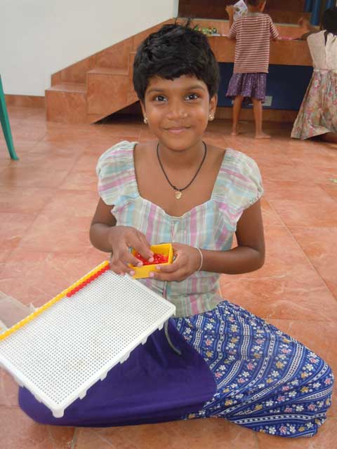 Als wir ins Heim kamen, war Vihanga zunächst sehr schüchtern und nahm immer Reißaus, wenn wir uns ihr näherten, wobei sie ihr verschmitztes Grinsen aufsetzte. Nach einiger Zeit kristallisierte sich jedoch heraus, dass Vihanga eine unglaubliche Begabung für den Umgang mit Zahlen besitzt. In ihrer Nachhilfegruppe war sie die Einzige, die sofort verstand, wie man Zahlen addiert, indem man sie untereinander schreibt. Ihr macht das Rechnen so viel Spaß, dass sie nun so gut wie täglich zu uns kommt und Matheaufgaben einfordert. Obwohl sie neuen Rechenwegen gegenüber zunächst etwas kritisch ist, versteht sie sehr schnell und so hat sie innerhalb der letzten vier Wochen gelernt, bis zu vier Zahlen in die Millionenhöhe gleichzeitig und fehlerfrei zu addieren und große Zahlen schriftlich zu subtrahieren. In den letzten Tagen hat sie nun auch das schriftliche Multiplizieren sowie Dividieren gelernt. Ihre Auffassungsgabe, was Mathematik betrifft, ist wirklich unglaublich und sie lässt sich bei den Aufgaben, die sie sich seitenweise geben lässt, auch nie von den älteren Mädchen helfen und fängt schon an, im Kopf zu rechnen, während wir noch am Aufschreiben sind. Ihre Mathematiknote ist dementsprechend besser als die der anderen beiden Mädchen, die mit ihr in dieselbe Klasse gehen. In den anderen Fächern ist sie jedoch eher mittelmäßig, nur in Tamil erzielte sie eine noch höhere Punktzahl als in Mathematik, was uns hoffen lässt, dass sich diese Sprachbegabung auch bald auf das Englische ausdehnen wird.