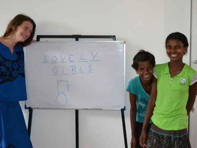 Das ist der Satz, mit dem Achini und Sachini quasi jeden Montagmorgen aus dem Bett fallen und der zeigt, wie sehr die Beiden sich auf unsere Englischstunde, die am Nachmittag stattfindet, freuen. Von montags bis freitags findet im Angels Home in den Nachmittagsstunden Englischunterricht statt, den die Praktikanten vor- und nachbereiten und sich dabei an einem Lehrplan orientieren. So werden von den grundlegenden Dingen, wie des Erlernens des ABC’s über einfache Konversationen bis hin zu anspruchsvollen Themen viele Bereiche abgedeckt, um den Mädels, unterstützend zum Unterricht in der Schule, in kleinen Gruppen die englische Sprache zu vermitteln.