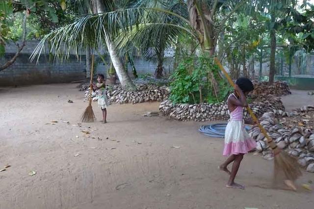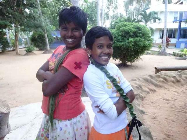 Auch der Erfindergeist der Mädchen beeindruckt mich immer wieder. Kokosnussschalen werden zum Geschirr, wenn man auf dem Spielplatz ein Kaffeekränzchen nachspielen will und kurze Haare stellen kein Hindernis dar, wenn man einander frisieren möchte. Schnell werden Palmenblätter in eine Perücke verwandelt und Zöpfe geflochten.