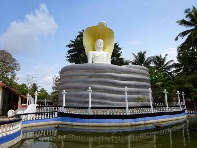 Wir gehen durch das Eingangstor und vor uns wird eine Gruppe verschiedener kleiner Gebäude sichtbar. Am exotischsten ist das Tempelgebäude, das aussieht wie eine zusammengerollte Schlange. Aus der Mitte ragt ein riesiger sitzender Buddha hervor hinter dem sich der gigantische Kopf der Schlange erhebt. Buddha wird von der Schlange beschützt, erklärt mir meine Begleiterin. ![]()